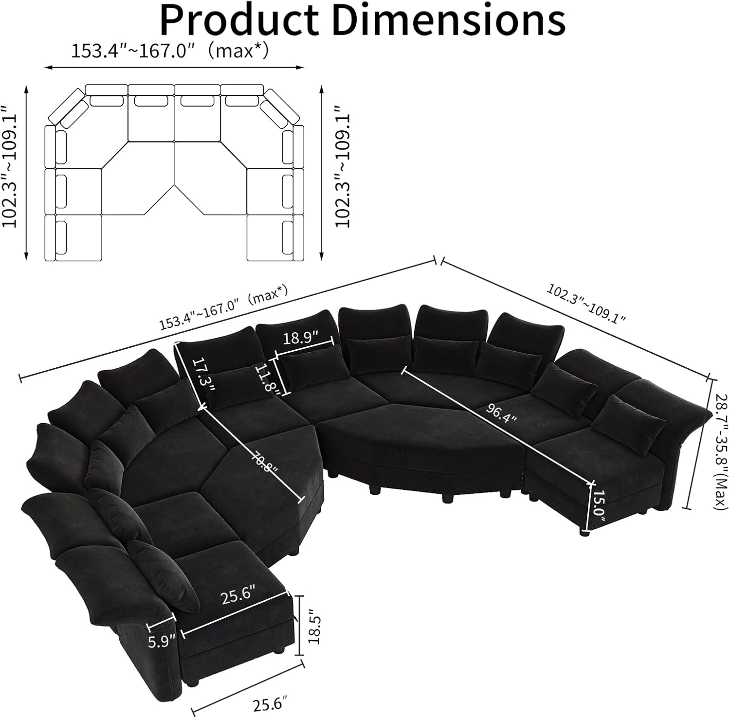 167″ Oversized Modular Sectional Sofa with 6-Side Deep Seat, Large Flower Sectional Couches for Living Room with Adjustable Armrest, High Backrest & Storage Seat, Black Chenille