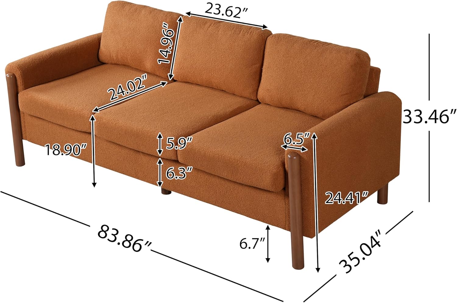 83.86″ 3-Seater Sofa, Curved Armrest with Integrated Solid Wood Legs, Teddy Velvet Fabric, High Weight Capacity (250 lbs/seat), Durable Solid Wood Frame, Orange