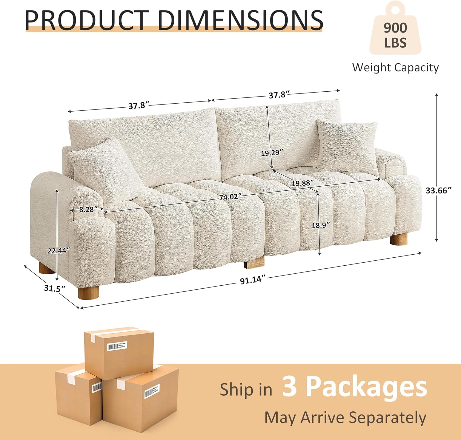 - Dimension and Assemble:Deep seat sofa is shipped in 3 packages and comes with detailed installation instructions to help you easily assemble and enjoy,overall dimensions:91.14″W x 31.5″D x 33.66″H,seat height:18.9″.