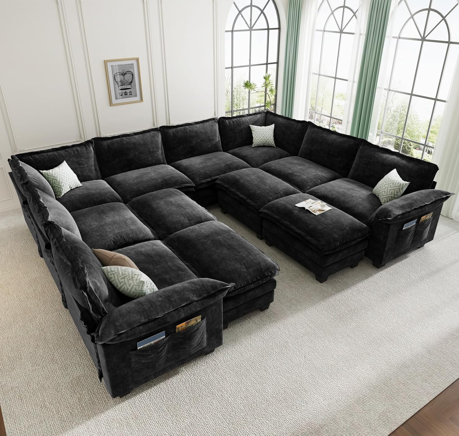 Huge U-Shaped Modular Sectional Sofa Bed, 12 Seater Cloud Couch with Ottoman, Chenille Sectional Couches for Living Room, Apartment, Black