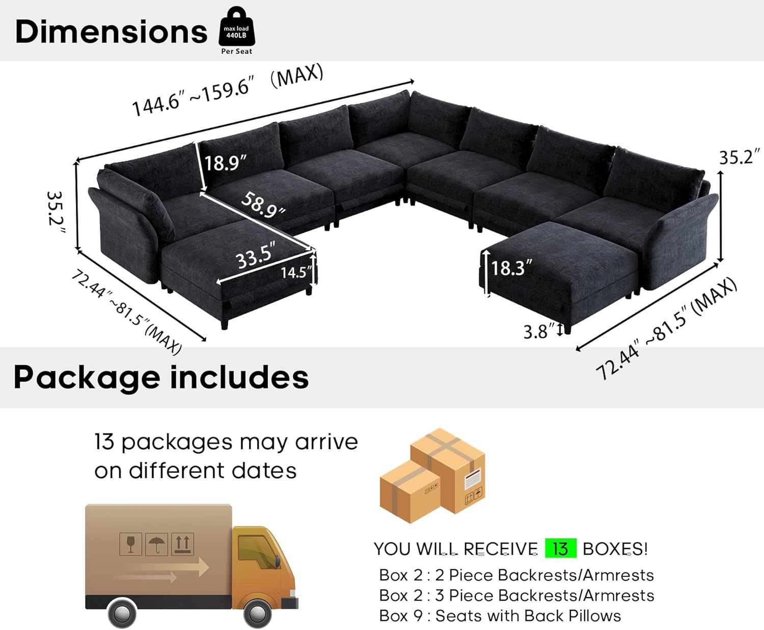 Oversized Sectional Couches for Living Room, 159″ Extra Wide, Deep Cloud Modular Sectional Sofa with Storage, Adjustable Arms, High Backs, 9 Seater, Dark Grey Chenille | Extra Wide Deep Seat, Thick Plush Cushion, Certified Fabric