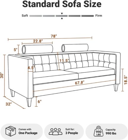 79-inch 3 Seater Couch with Storage, Mid-Century Vintage Retro Faux Leather PU Upholstery Tufted Cloud Comfy Deep Seat Sofa Couch for Living Room Office Apartment, Brown