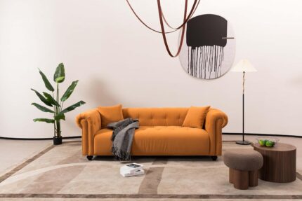 83.86″ 3-Seater Sofa, Curved Armrest with Integrated Solid Wood Legs, Teddy Velvet Fabric, High Weight Capacity (250 lbs/seat), Durable Solid Wood Frame, Orange